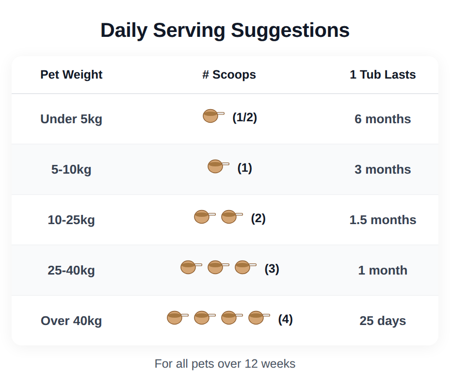 | Dog or Cat | Under 5 Kg | 0.5 Scoops |